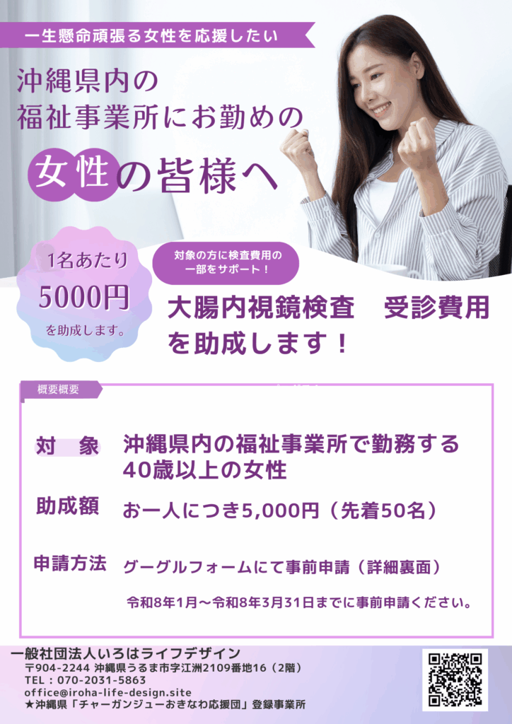 沖縄県内の福祉事業所にお勤めの40歳以上の女性の方へ大腸内視鏡検査費用の一部を助成します。助成額はお一人5000円で先着50名様です。添付のチラシをご確認の上お申し込みは下記のグーグルフォームにてお申し込みください!(^^)!